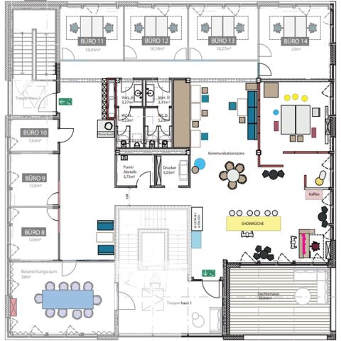 38 m² großer Besprechungsraum mit Top Ausstattung, direktem Zugang vom Treppenhaus (barrierefrei) oder individuelle Meeting Areas – sprich uns einfach an oder buche direkt hier